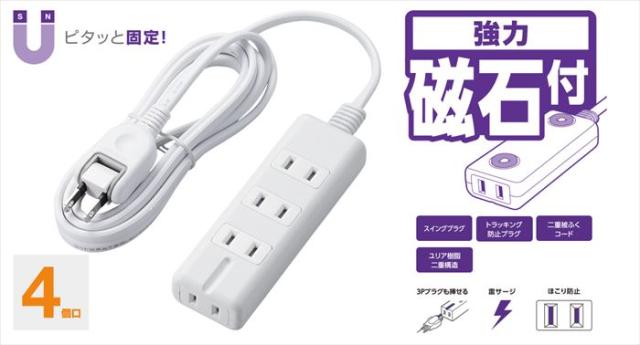 ■商品名:電源タップ 雷ガード 強力磁石付 4個口 2.0m ほこり防止シャッター 3Pプラグ対応 PSE適合 ホワイト