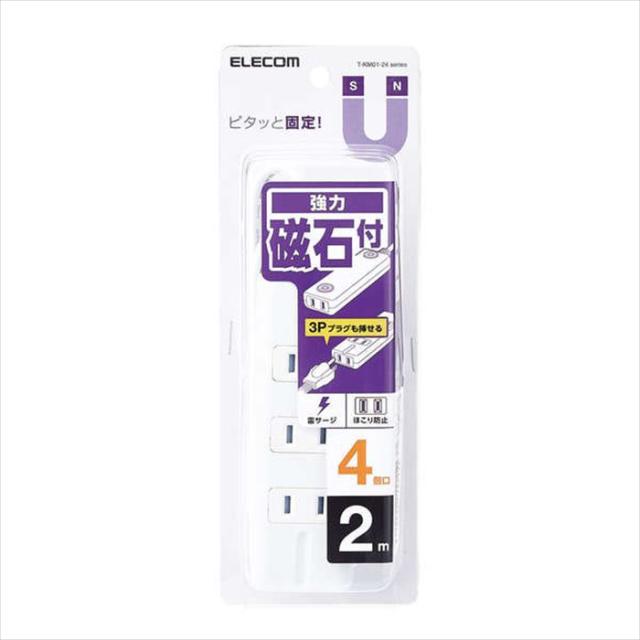 即納 代引不可 電源タップ 雷ガード 強力磁石付 4個口 2.0m ほこり防止シャッター 3Pプラグ対応 PSE適合 ホワイト エレコム T-KM01-2420WH