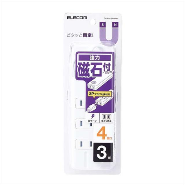 即納 代引不可 電源タップ 雷ガード 強力磁石付 4個口 3.0m ほこり防止シャッター 3Pプラグ対応 PSE適合 ホワイト エレコム T-KM01-2430WH