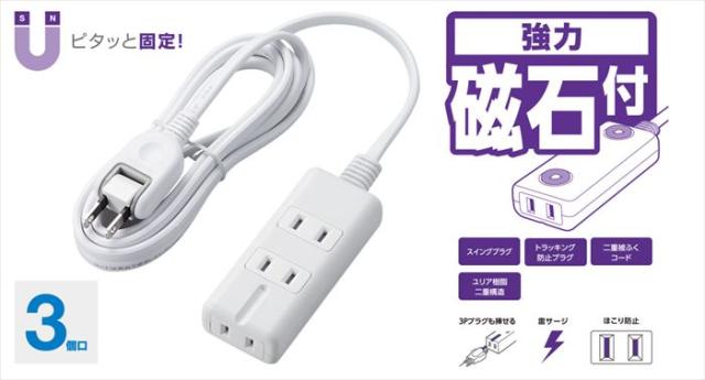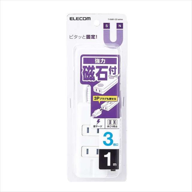 即納 代引不可 電源タップ 雷ガード 強力磁石付 3個口 1.0m ほこり防止シャッター 3Pプラグ対応 PSE適合 ホワイト エレコム T-KM01-2310WH