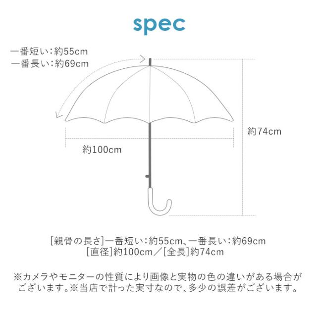 | サイズ | [親骨の長さ]一番短い:約55cm、一番長い:約69cm [直径]約100cm/[全長]約74cm ※サイズは当店平置き実寸サイズです。実際の商品とは多少の誤差が生じる場合がございます。あらかじめご了承ください。 |