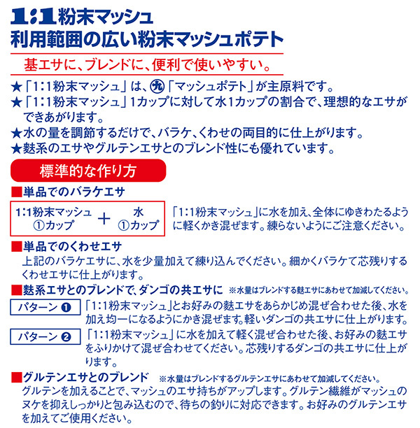 野釣りで基本となるマッシュポテトと、麸をバランスよく配合。水1:エサ1の割り合いで簡単に作れます。野釣りでも管理釣り場でもOK。