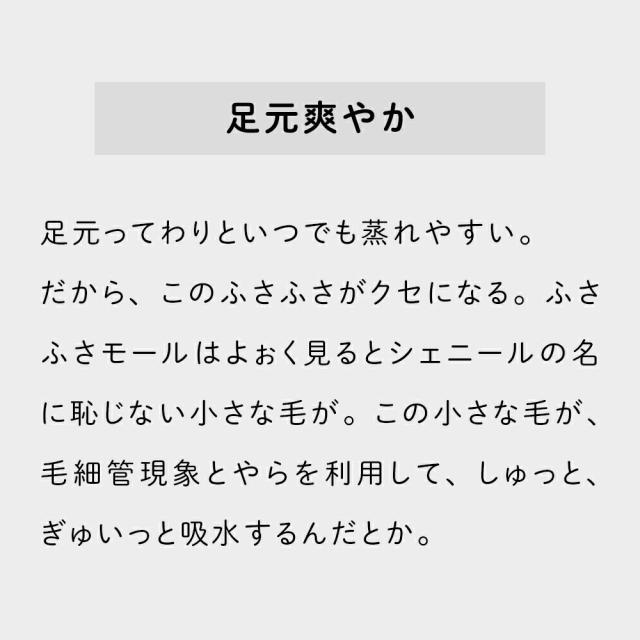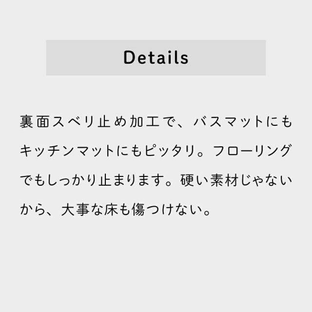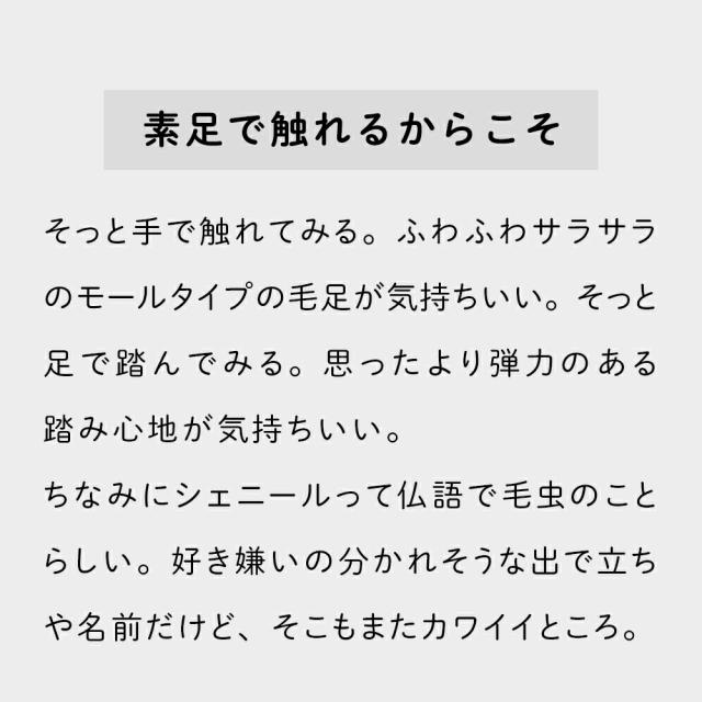 | ・素足で触れるからこそ そっと手で触れてみる。ふわふわサラサラのモールタイプの毛足が気持ちいい。そっと足で踏んでみる。思ったより弾力のある踏み心地が気持ちいい。ちなみにシェニールって仏語で毛虫のことらしい。好き嫌いの分かれそうな出で立ちや名前だけど、そこもまたカワイイところ。 ・足元爽やか足元ってわりといつでも蒸れやすい。だから、このふさふささがクセになる。ふさふさモールはよぉく見るとシェニールの名に恥じない小さな毛が。この小さな毛が、毛細管現象とやらを利用して、しゅっと、ぎゅぅっと吸水するんだとか。 ・Details裏面スベリ止め加工で、バスマットにもキッチンマットにもピッタリ。フローリングでもしっかり止まります。硬い素材じゃないから、大事な床も傷つけない。 | |