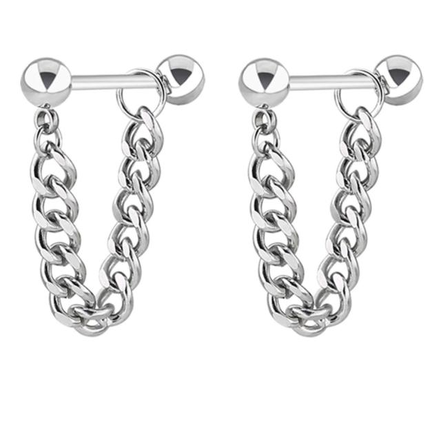 シンプルなチェーンのピアスです。通常の耳たぶはもちろん軟骨部分にも装着可能で、鎖の存在感が強いアクセサリーです。両耳用2個セットになります。片耳に2個つけるなどお好みのスタイルで楽しめるピアスです。
