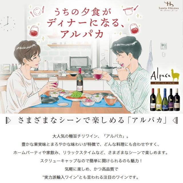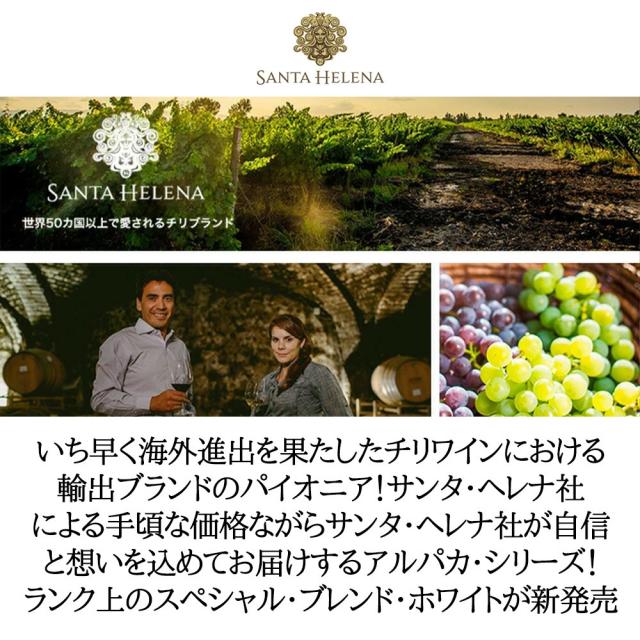 いち早く海外進出を果たしたチリワインにおける輸出ブランドのパイオニア!サンタ・ヘレナ社 による手頃な価格ながらサンタ・ヘレナ社が自信 と想いを込めてお届けするアルパカ・シリーズ!ランク上のスペシャル・ブレンド・ホワイトが新発売