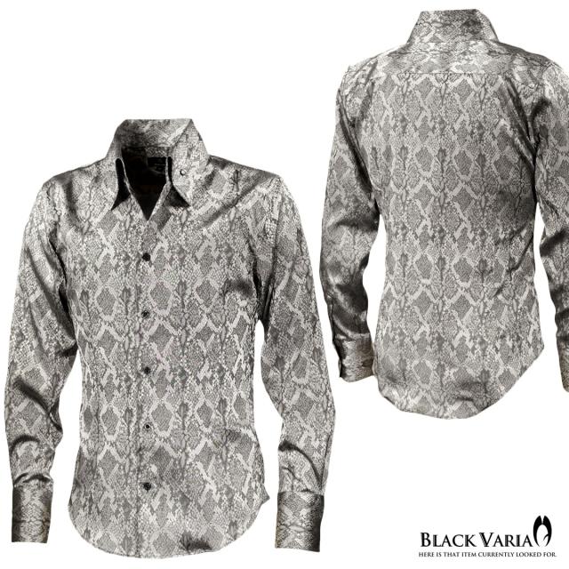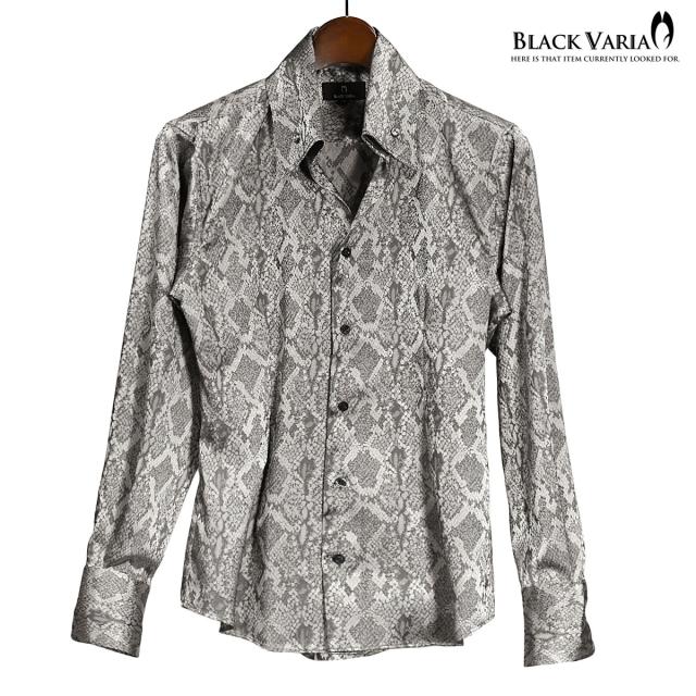 サテンシャツ ドレスシャツ スワロフスキー釦 スキッパー 長袖 パイソン柄 ヘビ 日本製 ボタンダウン スリム(グレー灰) 191250
