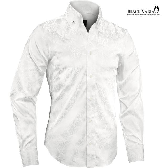 サテンシャツ ドレスシャツ スワロフスキー釦 スキッパー 長袖 パイソン柄 ヘビ 日本製 ボタンダウン スリム(ホワイト白) 191250