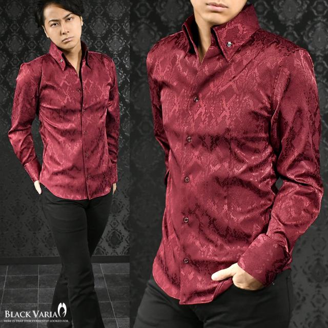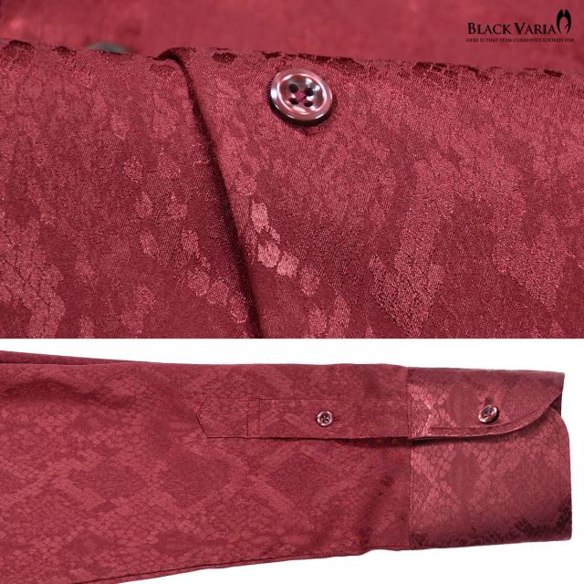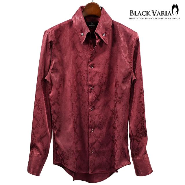 サテンシャツ ドレスシャツ スワロフスキー釦 スキッパー 長袖 パイソン柄 ヘビ 日本製 ボタンダウン スリム(ワインレッド赤) 191250