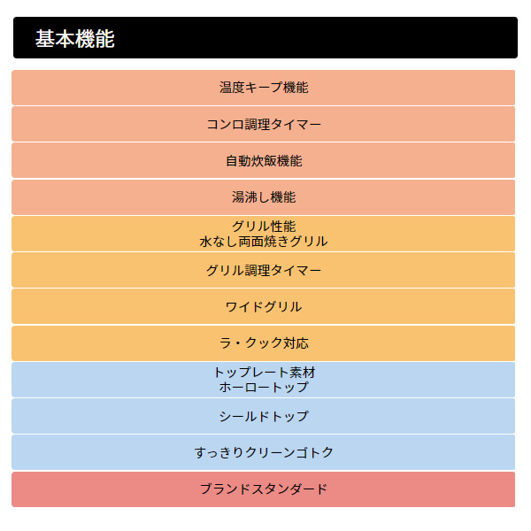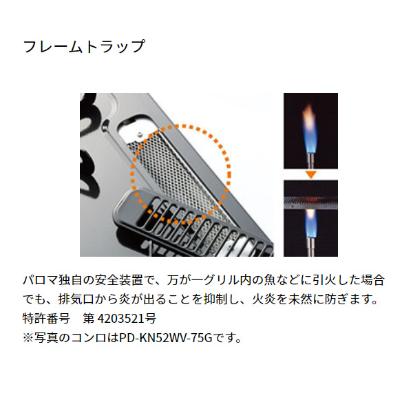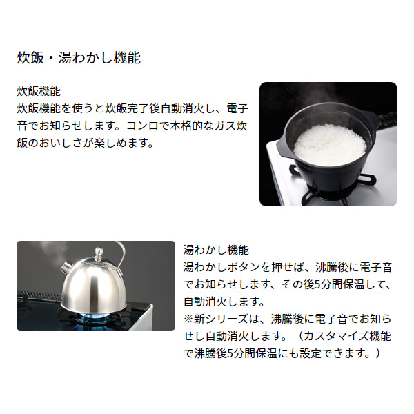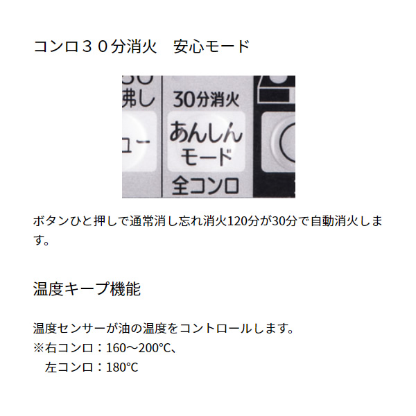 | ガス消費量kW | 強火力:4.20 標準:- 小火力:1.30 グリル:2.02 |