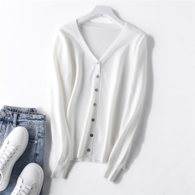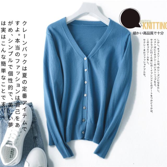 カーディガンとして羽織るのも、ボタンを留めてプルオーバーっぽく着こなすのもオススメの定番サマーニットのVネックカーディガン。