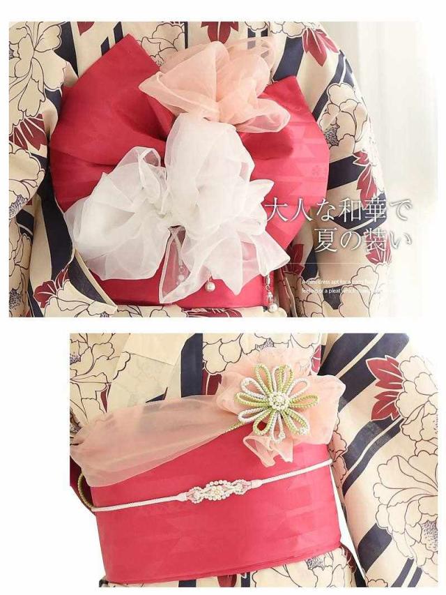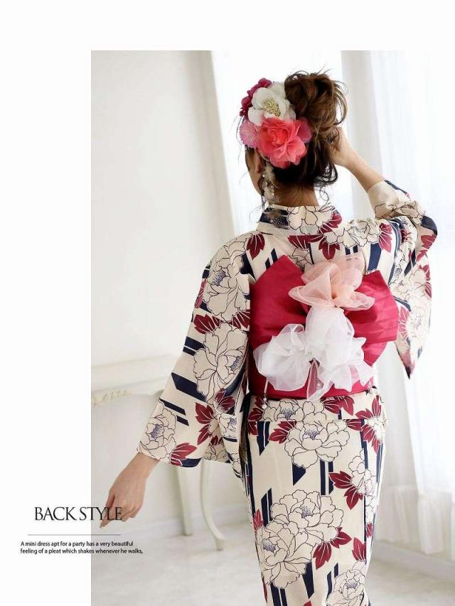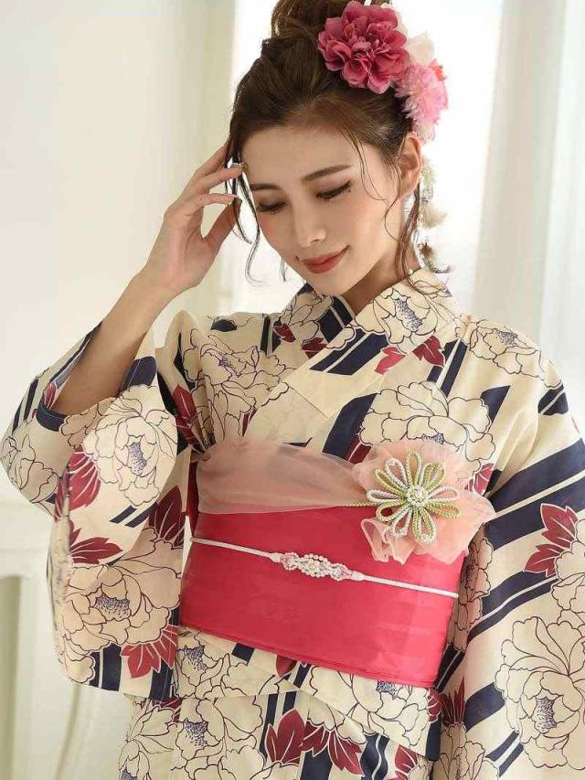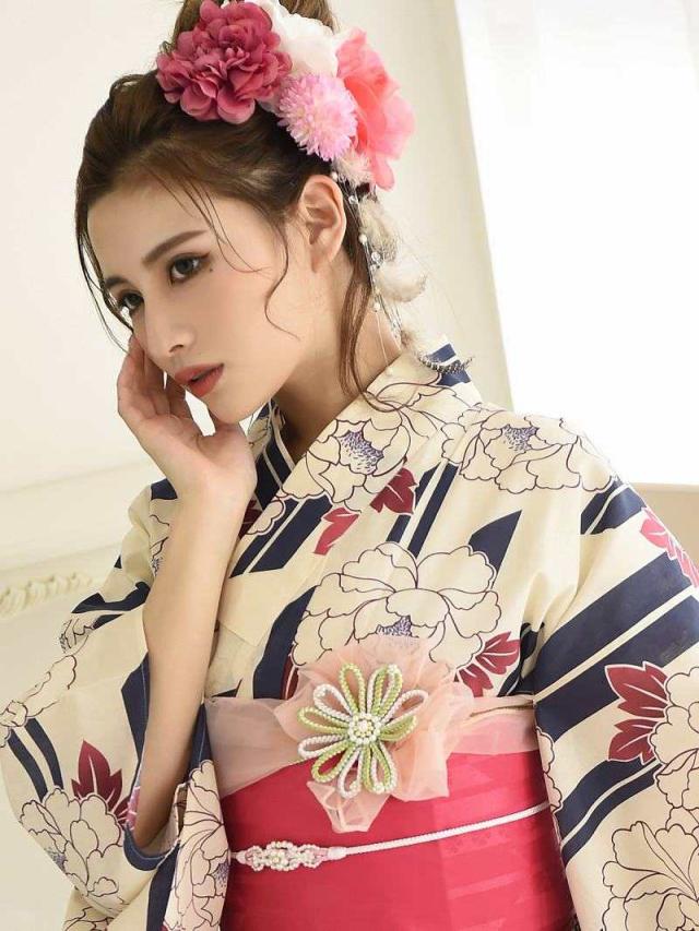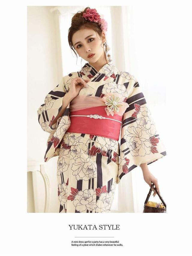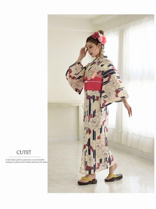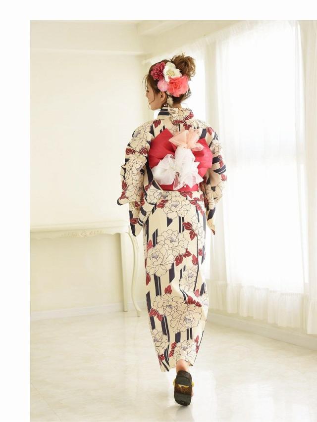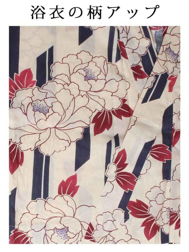 ☆牡丹×ストライプ柄がレトロモダン風で白色ゆかたがかわいく着れちゃうレディース浴衣♪