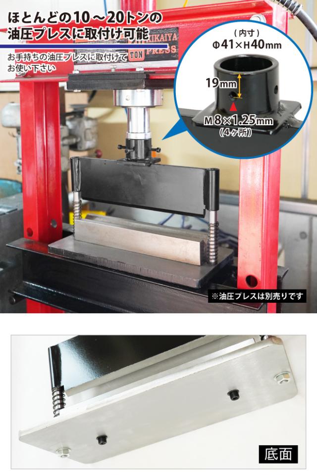 油圧プレス用アタッチメント ●お手持ちの10〜20tの油圧プレスに取り付けてお使い下さい ※プレス機とアタッチメントを固定するM8ネジは付属しておりません ●本品は組み立てが必要な商品です(必要工具:六角棒レンチ M6、スパナ M19) ※組立方法は付属の取扱説明書にてご確認ください ●油圧プレス本体は別売りです ※本製品は新品ですがインポート品のため製造過程で外見に細かい傷がある場合が ございますが、 性能上、問題ございません 外見保証はございませんので予めご了承ください 【板厚6mmの使用目安】