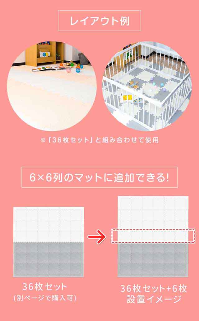 パズルみたいに組み合わせて敷くジョイントマットの「6枚セット」販売ページです。別売りのジョイントマットセットや単品パーツと合わせて、様々なレイアウトを行うことができます。