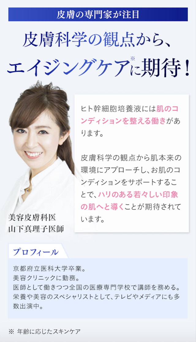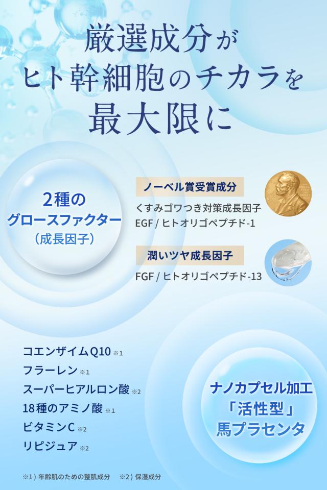 ◆今、大注目!美容皮膚科医も太鼓判の「高純度ヒト幹細胞培養液」を厳選配合。最先端医療から生まれた次世代スキンケアを体感して下さい。EGF、FGF、ナノカプセル加工馬プラセンタを配合。