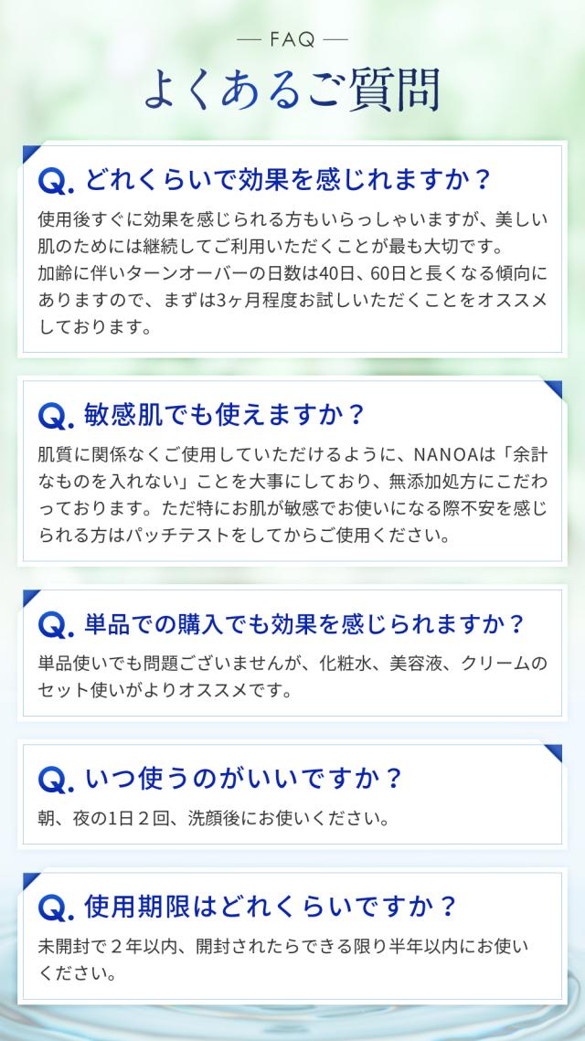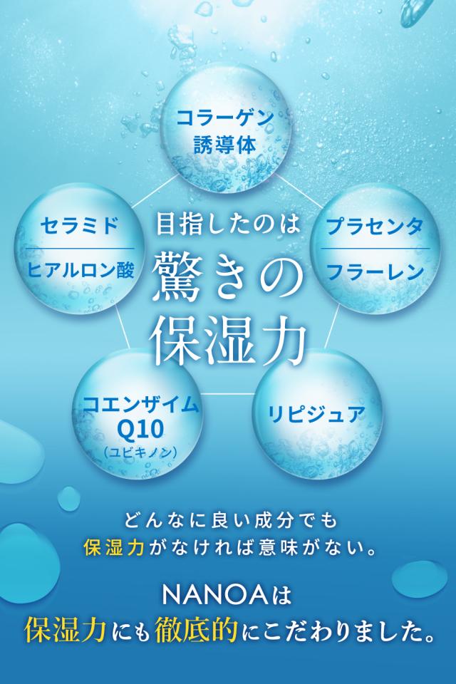 ◆成分が良くても保湿力がなければ意味がない。セラミド、ヒアルロン酸、プラセンタ、フラーレン、ユビキノンを配合し、NANOAは圧倒的保湿力にこだわりました。