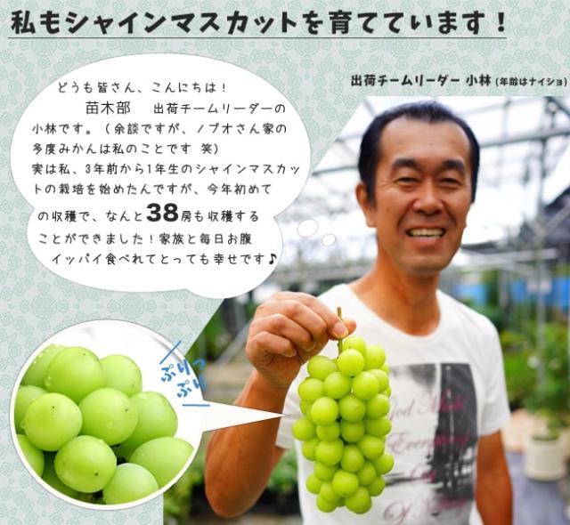苗木部スタッフの信夫さんはミカン農家でぶどうは素人でした。1年生接ぎ木苗を植えて3年後には30房以上取れました。お盆に孫たちにふるまってからシャインマスカットにハマってしまいました。この商品は3年生大苗、うまくいけば1〜2年で収穫できると思います。
