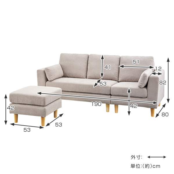 | サイズ | 座面高:約 42(cm) ソファー:約 幅190×奥行80×高さ82(cm) 座面高:約 42(cm) オットマン:約 幅53×奥行53×高さ42(cm) |
