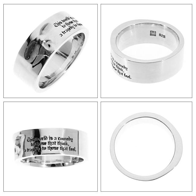 リングの中に溶け込んだようなデザインのスカルを配置した、幅広のメッセージ入りリング。