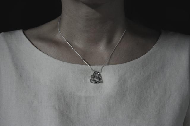 2人の想いが重なり合うかの如く、2つのハートが絡み合い1つの形となっていくペンダント。