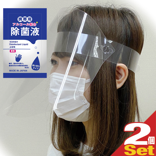 【即日発送】【メール便(日本郵便)】 フェイスシールド×2個 + マイン携帯用アルコール配合 除菌液(2mL)×2枚セット - ウイルス飛沫、花粉、ほこりから顔を保護するシールド開閉型のフェイスマスク。【フェイスガード】【日本製】【送料無料】