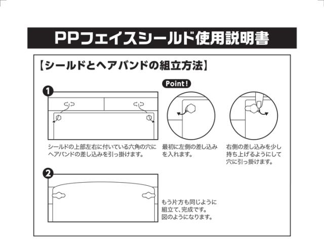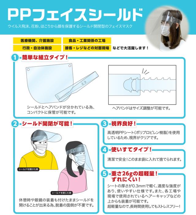 | 商品説明 | 1.簡単な組み立てタイプ! シールドとヘアバンドが分かれている為、コンパクトに保管が可能です。 ヘアバンドはサイズ調整可能です。 2.シールド開閉が可能! 休憩時や眼鏡の装着も付けたままシールドを開けることができる為、脱着の面倒が不要です。 3.視界良好! 高透明PPシート(ポリプロピレン樹脂)を使用しているため、視界が良好です。 4.使い捨てタイプ!. 清潔で安全!このまま袋に入れて捨てられます。 5.重さ26gの超軽量!ずれにくい! シートの厚さが0.3mmで軽く、適度な強度があり、使いやすい仕様です。また、各工場や現場で使用されているヘアーキャップなどの上からも装着が可能です。 超軽量なので、長時間使用してもストレスフリー 医療機関、介護施設、食品工場、工業関係の工場、行政・自治体施設、接客、レジなどの対面現場などで大活躍します! |