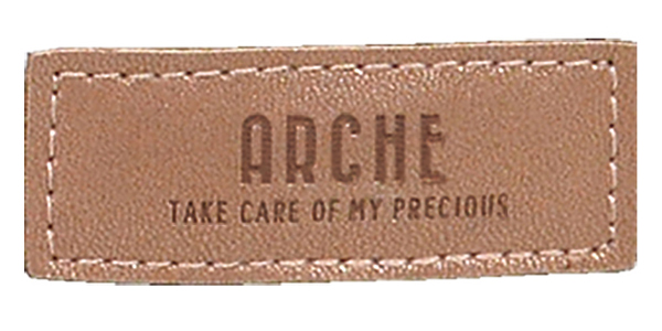 型押しでロゴをあしらった高級感のある合皮ネームタグがついています。