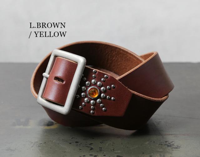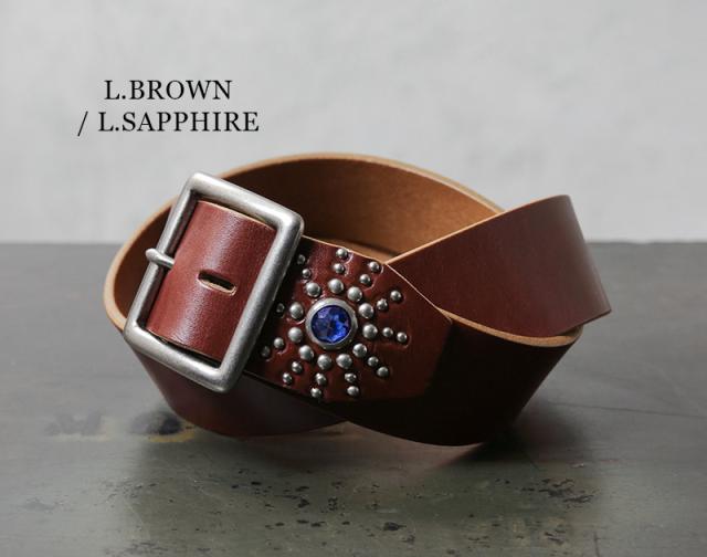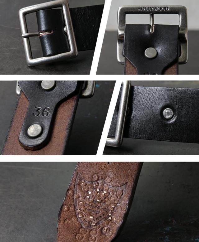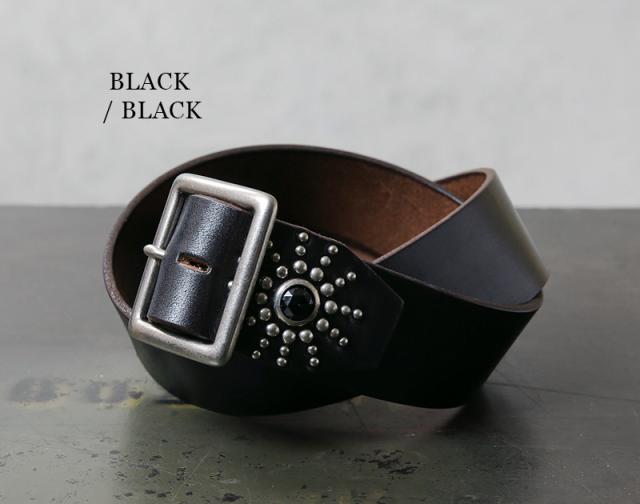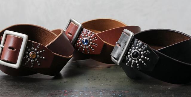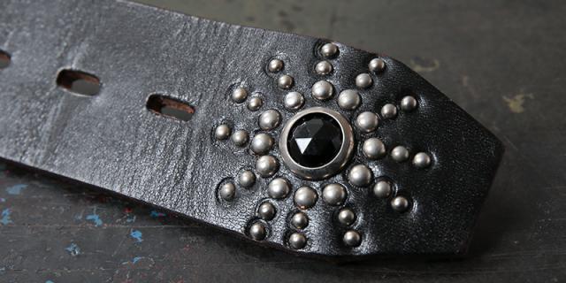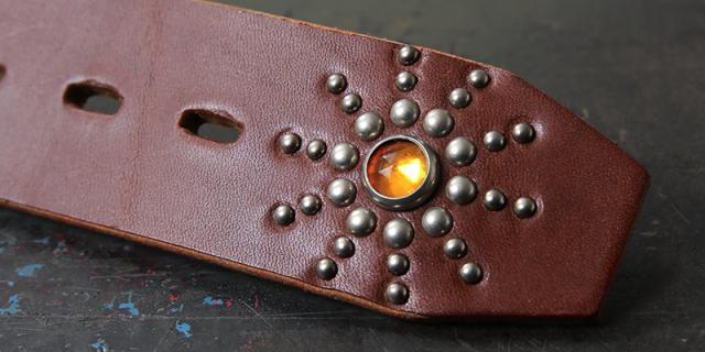 上質な肉厚のカウレザーのベルトエンド部分にスタッズを施したHTCの大定番アイテムです。スタッズはニッケル、ストーンはアクリルではなく輝きの良いガラスを使用。職人の手でひとつひとつ丁寧に打ち込まれています。ベルトとニッケルのバックルにはヴィンテージ加工が施されており、使い始めから味を堪能できる逸品。エンド裏にはブランドロゴ刻印入り。ブランドネームが刻印されたバックルはスナップボタンで着脱可能で、他のものに付け替えもできます。