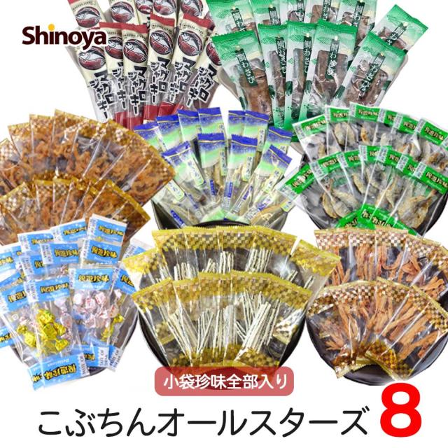 小袋 珍味 おつまみ 8種類 こぶちんオールスターズ8 さきいか あご マグロセロ 貝ひも 焼きあじ 黒ごま物語 マグロジャーキー 鯛わさび 複数 まとめ買い アソート 送料無料 家飲み