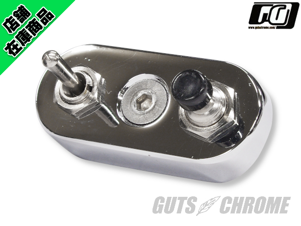 ハンドル廻りのカスタムに欠かせない、アルミ削り出し・ガッツクローム・オリジナル・カスタムスイッチボックスです。ハンドル廻りをスッキリさせるにはもってこいのアイテムです。2穴スイッチボックスアッセンブリーは、ウインカーに仕様できる固定式のトグルスイッチとホーンやスターターに使用可能な非固定式のプッシュボタンが付属します。※トグルスイッチは固定タイプです。セルフキャンセラーの車輌には適合しません。取付には配線中通し作業・配線のスイッチ本体へのハンダ付け・ハンドルへの取り付け穴加工・取り付けタップ加工などが必要になります。適合のパイプサイズは1インチ(25.4mm)です。