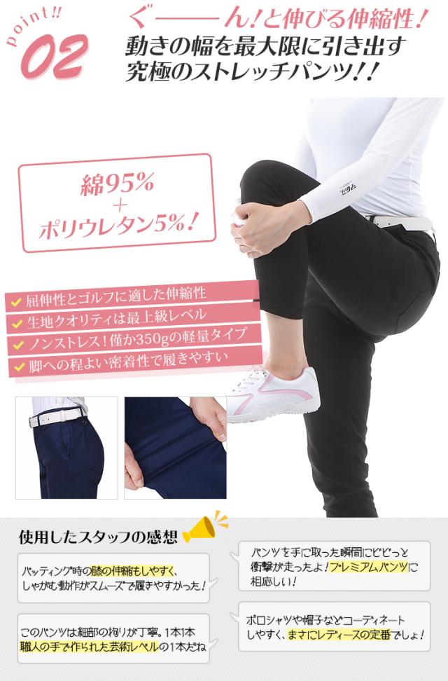 ゴルフパンツレディース仕様は、伸縮性に優れたポリウレタン5%にコットン95%の素材比で「スィング、しゃがむ、歩く」ゴルファーのパフォーマンスを最大限に引き出します。単色カラーは、シャツや帽子、靴にも合わせやすく、よく似合います。シンプルだから無数の組み合わせでお洒落を楽しむことが可能です。ベルトループで腰位置をガッチリ固定し、ゴルフ専用ベルトもぴったり収まるサイズ感となっております。僅か350gの軽量化を図り、生地の伸縮率も高いことから、非常に履き心地が良いゴルフパンツです。ズボンのシルエットもタイトなのに太もも回りに窮屈感がなく、美脚を保ちながら、その機能性にもご満足いただける仕様となっております。右ポケットには「ティペグ」差し込んで収納可能な本格タイプです。洗濯してもその美脚シルエットを損なわずに、次回も初回と変わらない履き心地が楽しめます。ゴルフスィングの負荷やパンツにかかる圧力バランスを分析し、パンツと身体のストレス分散をはかるため、究極のストレッチ仕様となっております。ゴルフ場での高いパフォーマンスに拘る方は必見です!ゴルフ練習場、打ちっぱなしでの練習パンツと数枚お持ちになるのもオススメです。