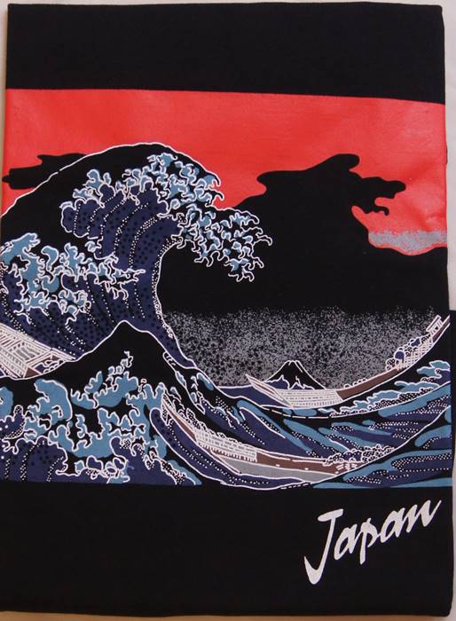 現在の横浜本牧沖から富士を眺めた図。「浮世絵と言えば、これ!」というくらい世界的に有名な作品です。北斎が長年に渡って描いてきた波の作品の中でもダイナミックな構図と静と動が交錯する画面は圧巻の一図です。国内外の有名な美術館・博物館にも所蔵され、現代のアーティストに今なお影響を与え続ける世界的名画といえるでしょう。その神奈川沖浪裏の図柄をアレンジして制作しました、オリジナルTシャツです!