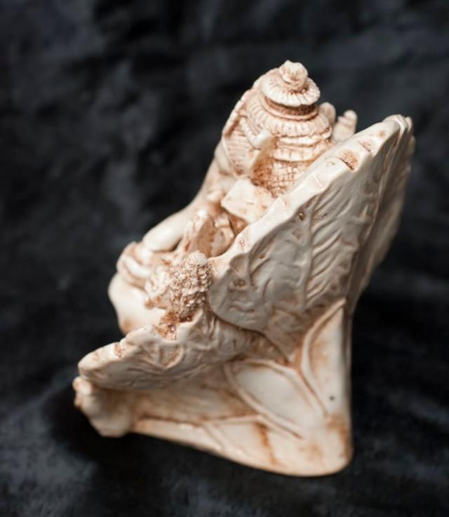 偉大なる神々が住まう国インドから重厚な神像が届きました。細部まで彫り込まれ、丁寧に仕上げられたガネーシャ像です。葉っぱに優雅に構えた姿が素敵ですね。どっしり、サイズも大きすぎず、小さすぎないちょうどいいサイズです。こちらは同じサイズの金属の物に比べると1/5以下のリーズナブルなお値段です。その秘密は、レジンというプラスチックで作られているから。金属で作られた神様像を型どりして、その型にレジンを流し込んで作っています。
