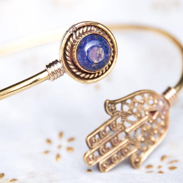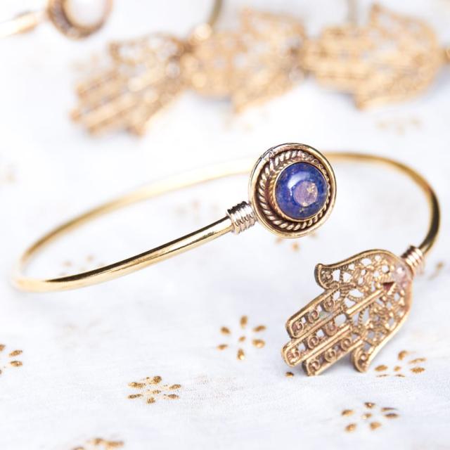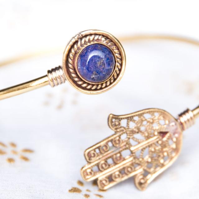 シンプルな細身のラインが美しい天然石付きのブレスレットです。ラピスラズリやタイガーアイ等の天然石がはめ込まれており、華奢なデザインは手元を美しくすっきりと魅せてくれます。すっきりとしたスリムなデザインなので、他のブレスレットと重ねてお使いいただいても素敵だと思います。主張しすぎないけれどもエスニックな雰囲気を醸し出してくれる一品です。■通販でも安心なフリーサイズ