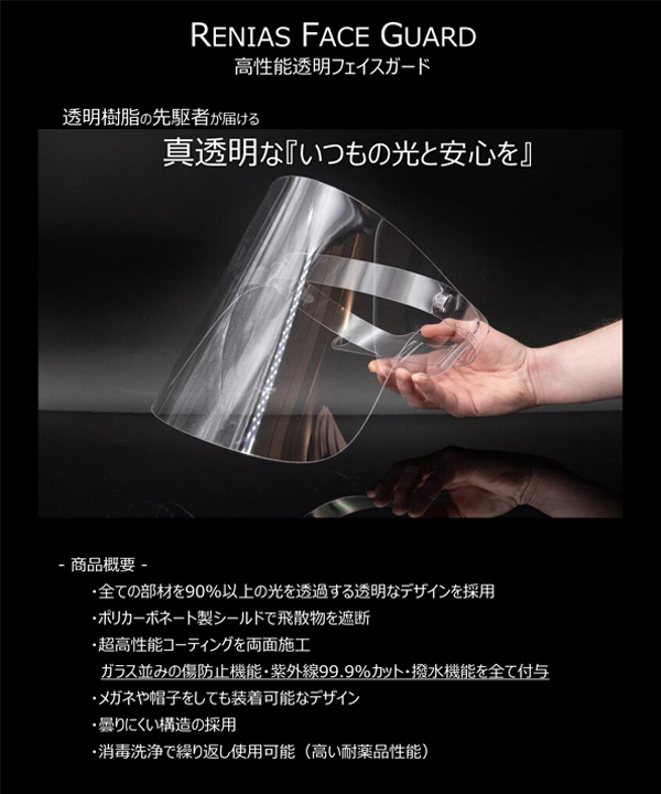 繰り返し消毒して使用するフェイスガードとして今の市場が求めている物にぴったりです。病院やコンビニなど日々の作業従事者の必須アイテムです。