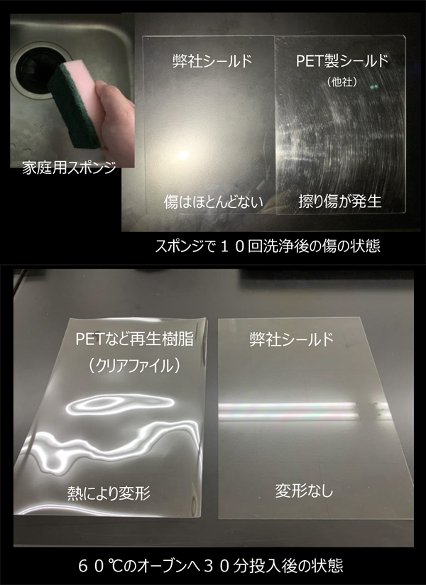 他社製品が使用するPETと違ってポリカーボネートを使用したレニアス社のフェイスガードは高い強度と耐薬品性を持ちます。強度の高いポリカは飛散物からも顔を保護できますし、熱にも強く、さらにはスポンジで10回擦ってもPETと違って擦り傷がつきにくくなっています。