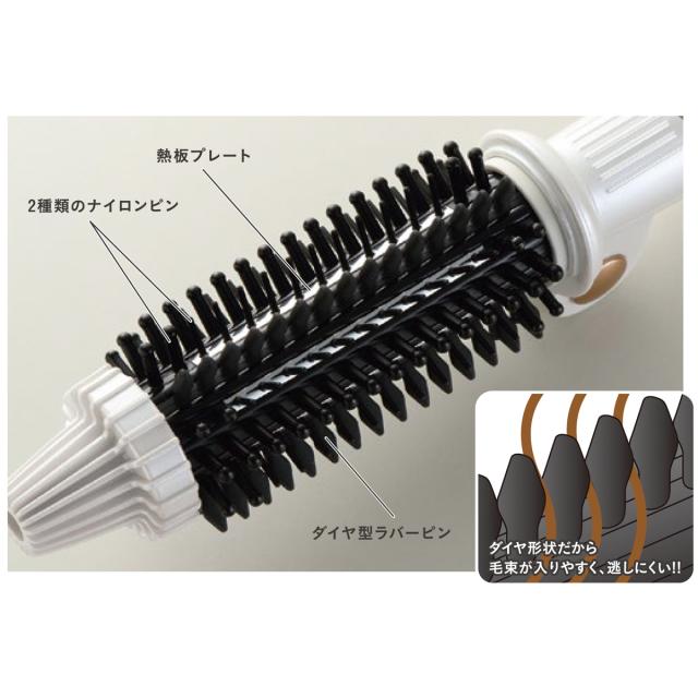 パイプ部には特殊形状をした「 ダイヤ型ラバーピン」と熱効率を高めるr熱板プレート」及び「2種類のナイロンピン」を搭載。 スタイリング時に脱落しやすい毛束をしっかりキャッチし、適度なテンションを与えるため、ツヤのある美しいスタイルが簡単? 素早く作れます。