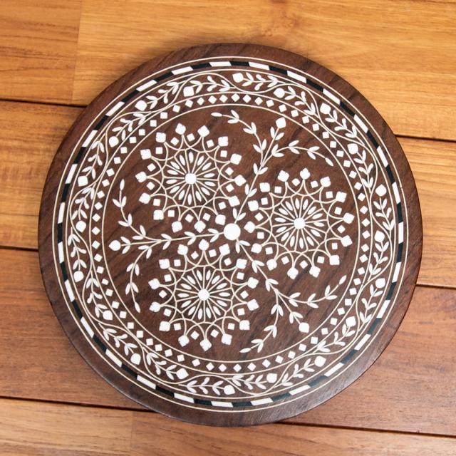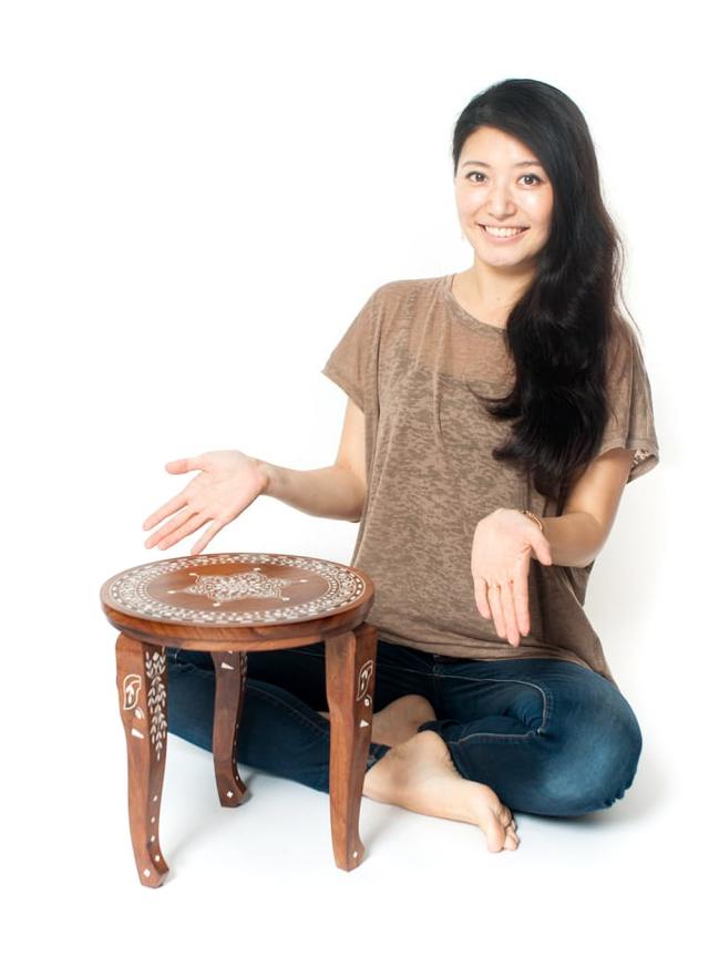 こちらのテーブルは、天然素材の木材をハンドメイドで製造しています。ですので、同じ柄でも木目の並びなどそれぞれ表情が異なり、手作りの温かさが感じられます。チャイ用テーブルとしてはもちろんのこと、電話やお香、植物などを置くのにもちょうど良い大きさです。