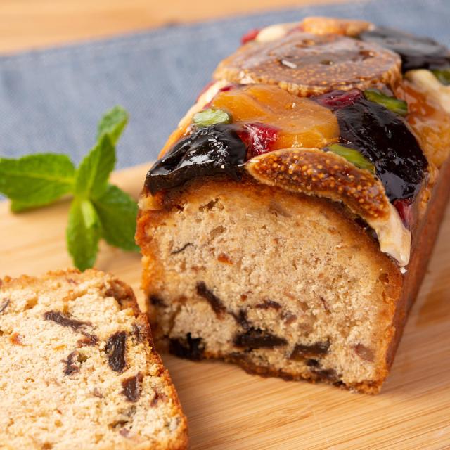 【フルーツと木の実を贅沢に使った見た目も華やかなパウンドケーキ】色とりどりのドライフルーツやナッツ類がたっぷりとのった『フルーツケーキ』をお届けします。