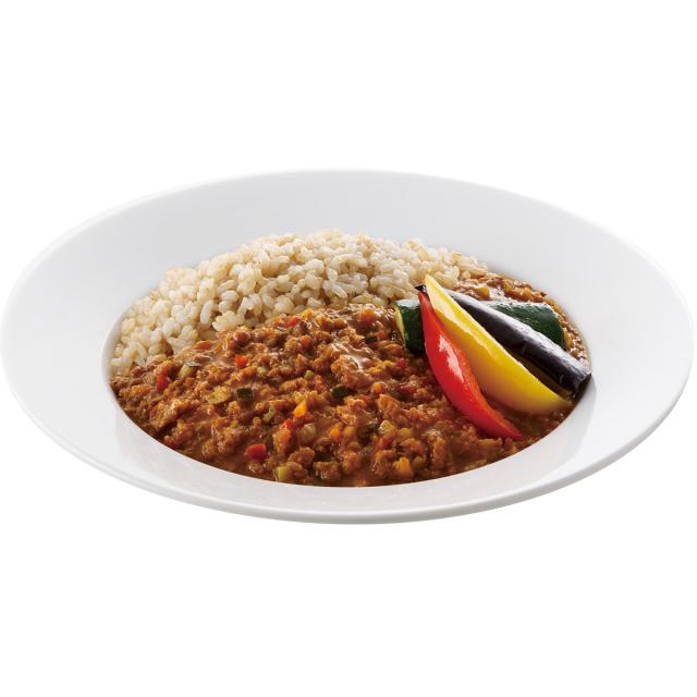 【お肉のような食感の大豆ミートが入ったヴィーガンレトルトカレー】『大豆ミートだから夜食にもうれしい ソイキーマカレー』は、お肉に似た食感の大豆ミートを使用した、満足感のあるレトルトカレー(マクロビオティック)です。8種のスパイスを使用していますので、深い旨みをお楽しみいただけます。マーガリン・バターは、不使用で、隠し味に味噌をプラスしました。植物性の原材料だけで出来ていますので、夜食としてもおすすめです。