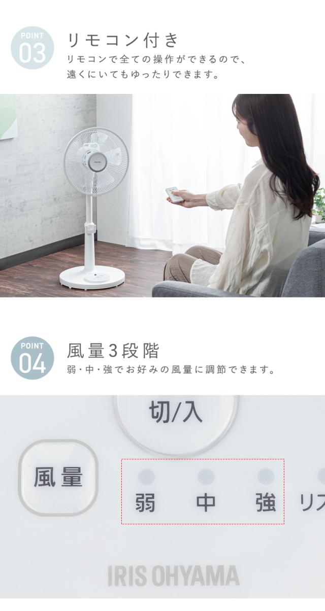 - 扇風機が、急に壊れて、 もう使う期間も一週間ぐらいしかないかな、 と思いましたが、たまたまアイリスのリモコン指導の 扇風機がお安く出ていたので購入を決めました 到着は普通でした 組立式でしたが説明書見なくても難なくできました。 前の扇風機は[弱]がものすごく弱かったのですが アイリスサンのは、私が想像してたのとピッタリの風量でよかったです。 あと1~2週間は使う機会が、ありそうなので まったりと涼まさせて頂きます ありがとうございました