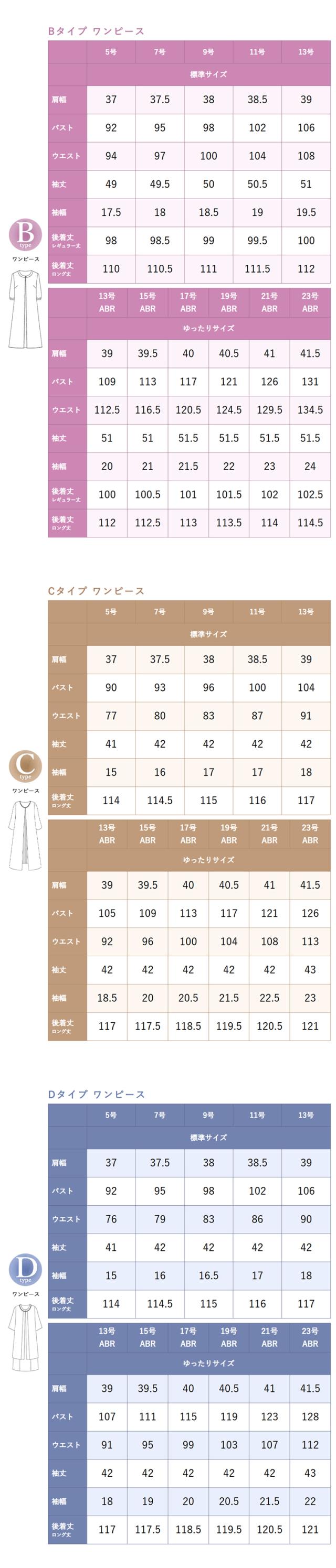 | サイズ | 5号・7号・9号・11号・13号・15号・17号・19号・21号・23号 小さいサイズ〜大きいサイズ(ラージサイズ)。ゆったりとしたABR体あり |