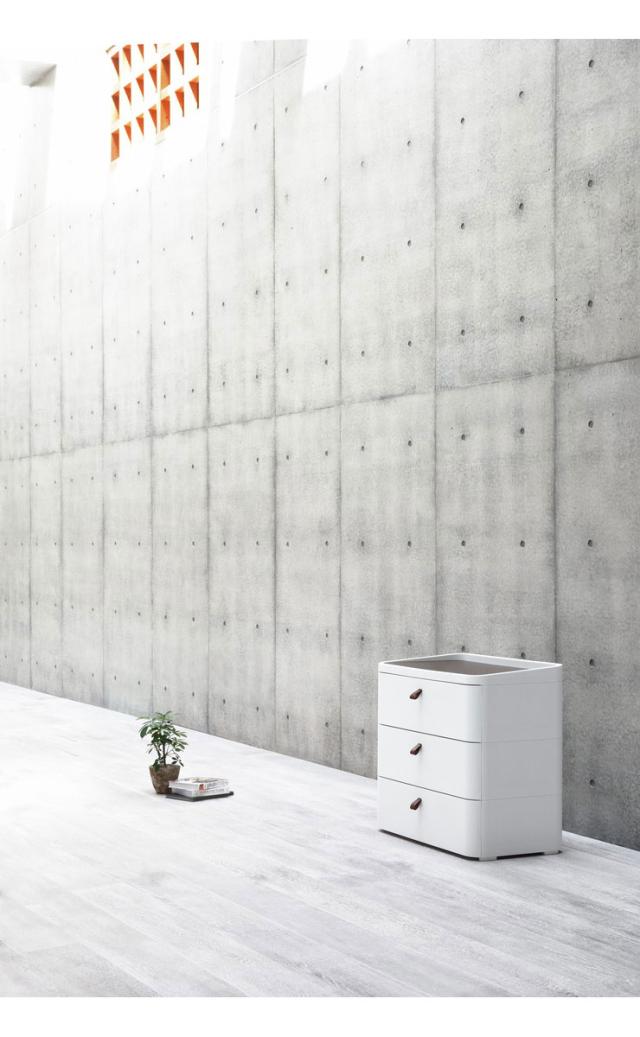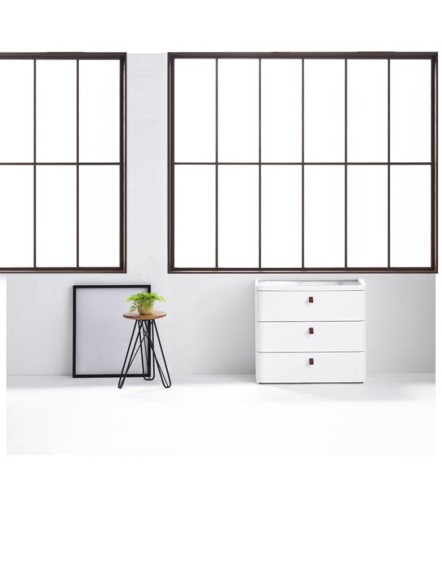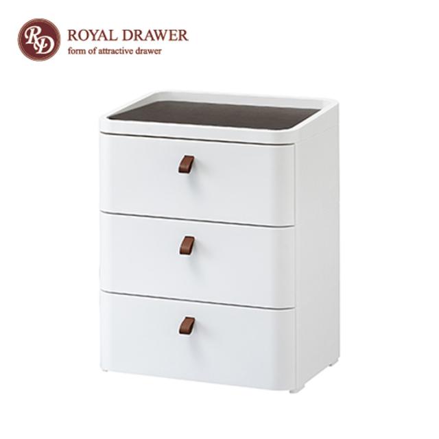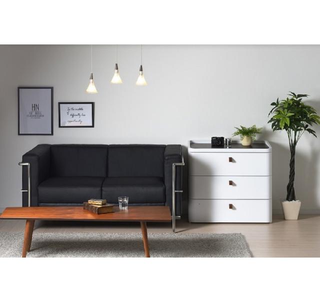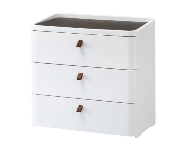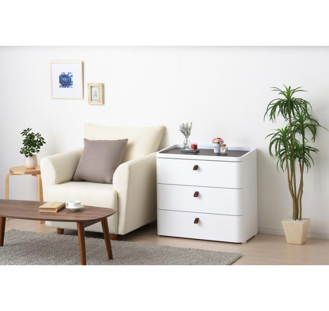 プラスチックとは思えない高級感。ホコリに強いALLカバーデザイン。リバーシブル天板で気分に合わせてカラーチェンジ。モダンな本革ハンドル。引き出しはスルッと閉まる仕様。