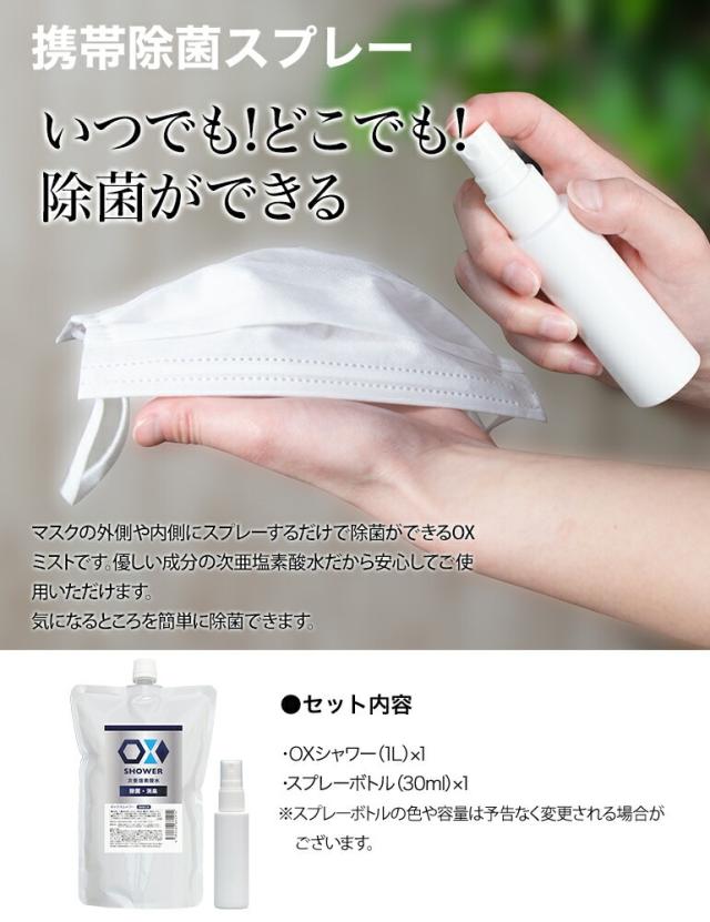 特許製法 次亜塩素酸水 OXシャワー オックスシャワー 1Lと携帯用30mlボトルセット 100ppm 除菌消臭スプレー 日本製 次亜水 次亜塩素酸水溶液 防災