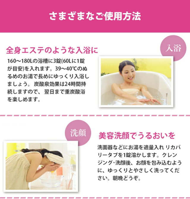 | 160〜180リットルのぬるめのお湯に3錠を溶かしてご使用ください。ゆっくりと15分以上の入浴をおすすめします。約60Lのお湯に1錠を溶かしてご使用ください。 |