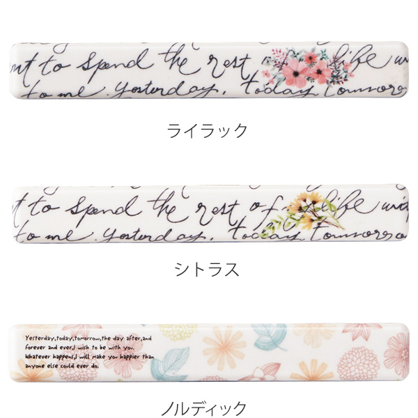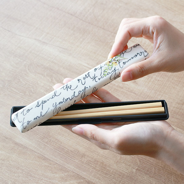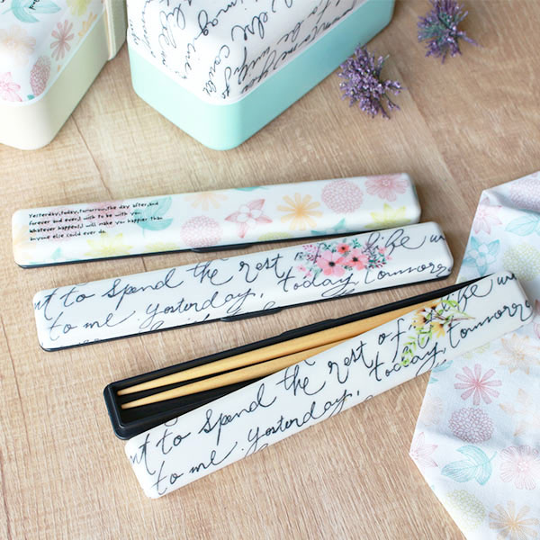 優しい花柄と手書き文字がレイアウトされた可愛らしい箸&箸箱セットです。蓋部分は布貼り加工を施しており、布の風合いを生かした素材感となっており、底部分はブラックカラーなので少し落ち着いた雰囲気です。