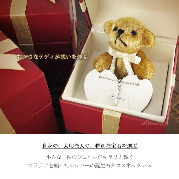(シルバーアクセサリー 誕生石 一粒石 華奢 細身 プラチナ プラチナコーティング ガーネット アメジスト アクアマリン ダイヤモンド ダイアモンド 天然ダイヤモンド 天然ダイアモンド エメラルド ブルームーンストーン ムーンストーン ルビー ペリドット サファイア ブルーサファイア トルマリン ピンクトルマリン ブルートパーズ トパーズ タンザナイト ホワイト 白 シルバー 銀 レッド 赤 ピンク ローズ ワインレッド 赤紫 紫 紺 ネイビー 青 ブルー アイスブルー すみれ色 水色 アクアブルー グリーン 緑 黄緑 イエロー 黄色 上品 清楚 大人かわいい 十字架 ラテンクロス クロス クロスネックレス 箱付き くま付き くま くまのぬいぐるみ 熊 熊のぬいぐるみ テディベア テディベアストラップ テディベア付き ぬいぐるみ付き)