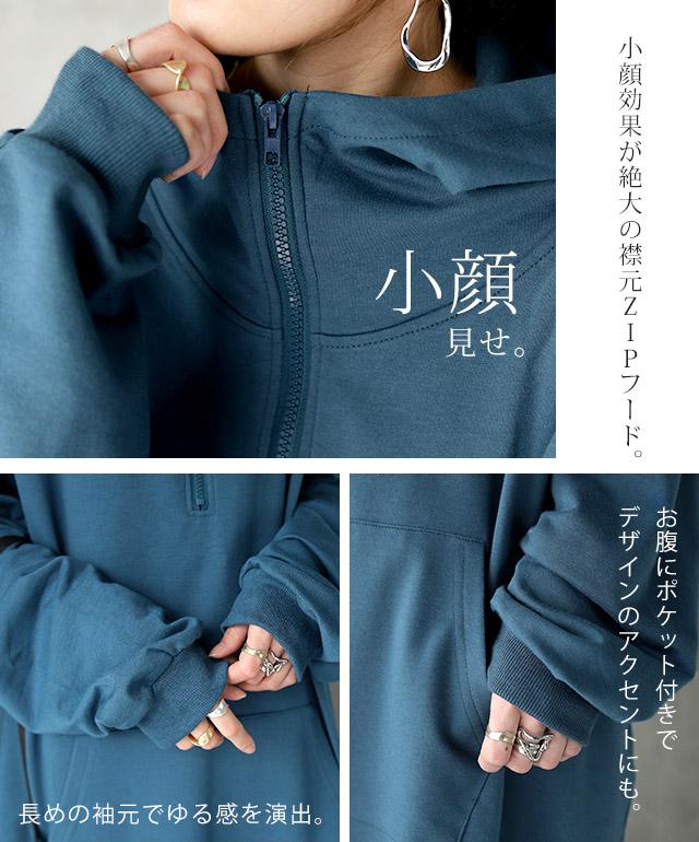 開けても閉めても小顔効果がある襟元ZIPフード。