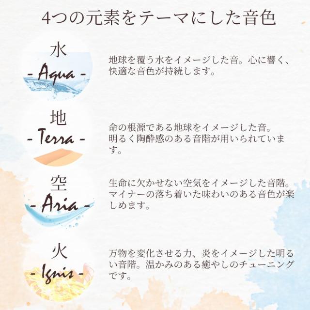 Ariaは生命が生きていくのに欠かせない空をイメージした音で、マイナー調でありつつも、落ち着いた味わいのある音です。