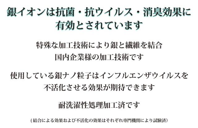 耐洗濯性処理加工をしており50回以上洗濯しても銀の脱落が見られないので、抗菌・抗ウイルスの効果が持続します。