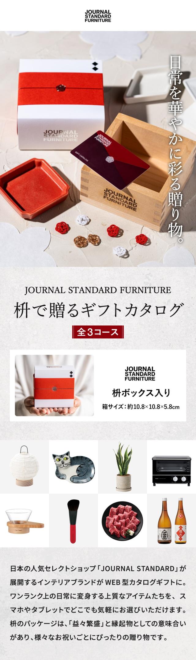 日本の人気セレクトショップ「JOURNAL STANDARD」が展開するインテリアブランドがWEB型カタログギフトに。ワンランク上の日常に変身する上質なアイテムたちを、スマホやタブレットでどこでも気軽にお選びいただけます。枡のパッケージは、「益々繁盛」と縁起物としての意味合いがあり、様々なお祝いごとにぴったりの贈り物です。